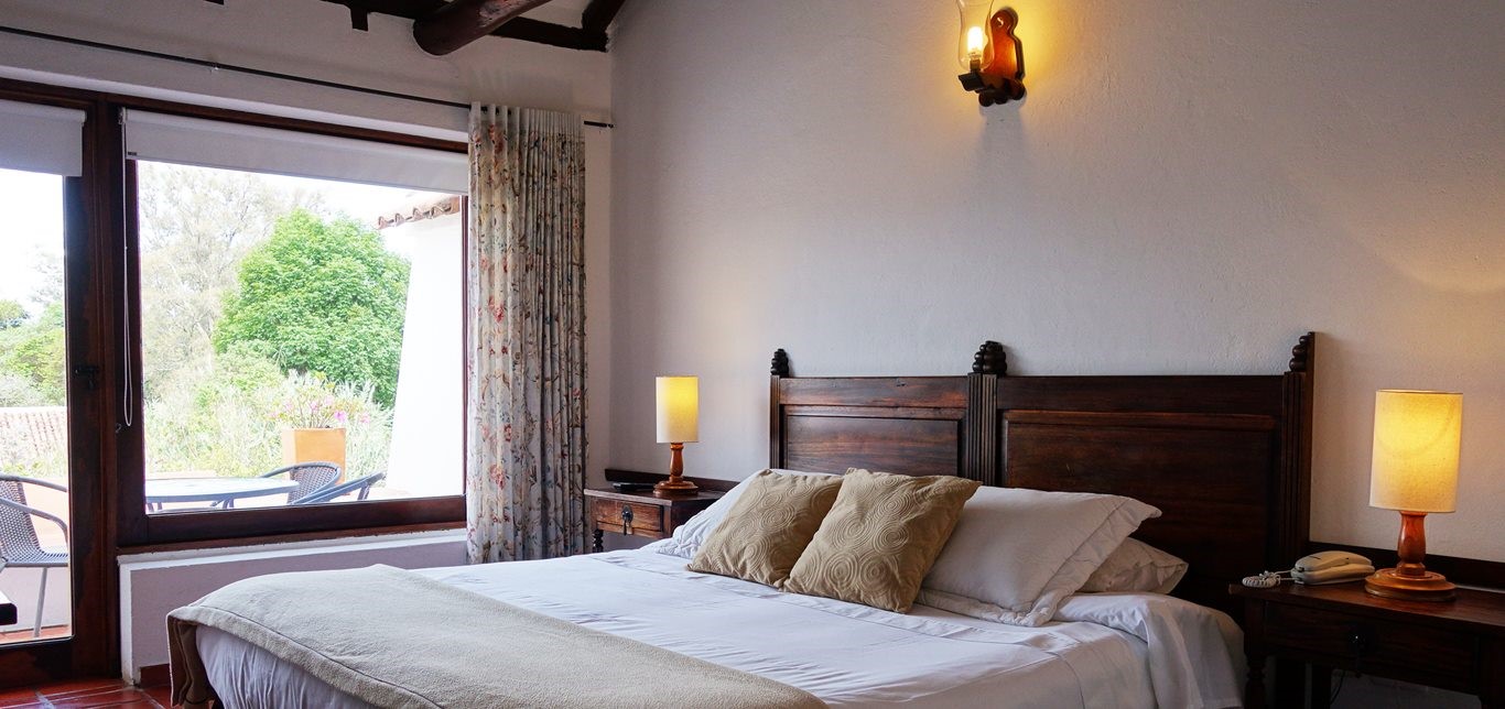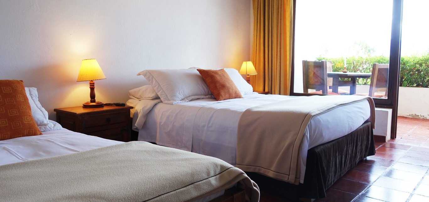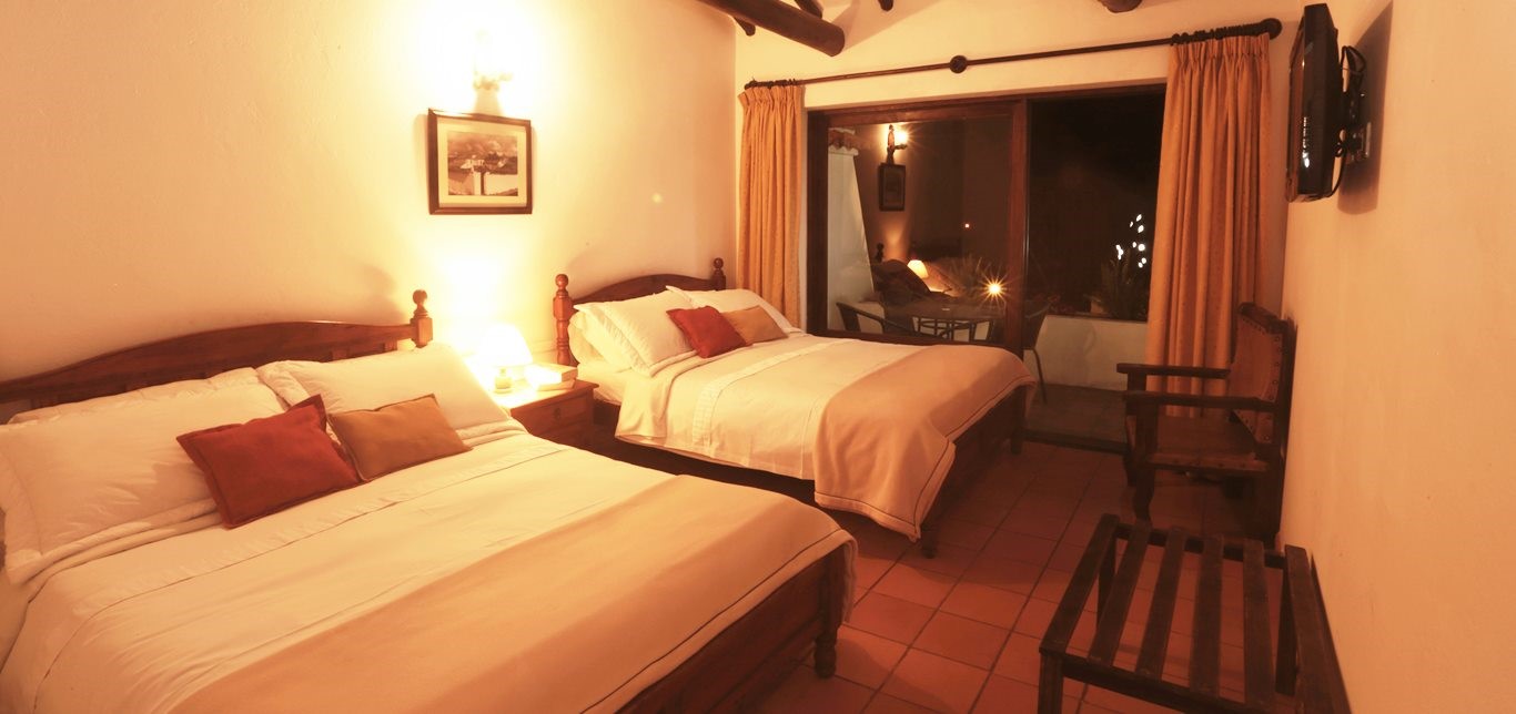 Habitación de estilo colonial con dos camas dobles, baño privado y terraza.